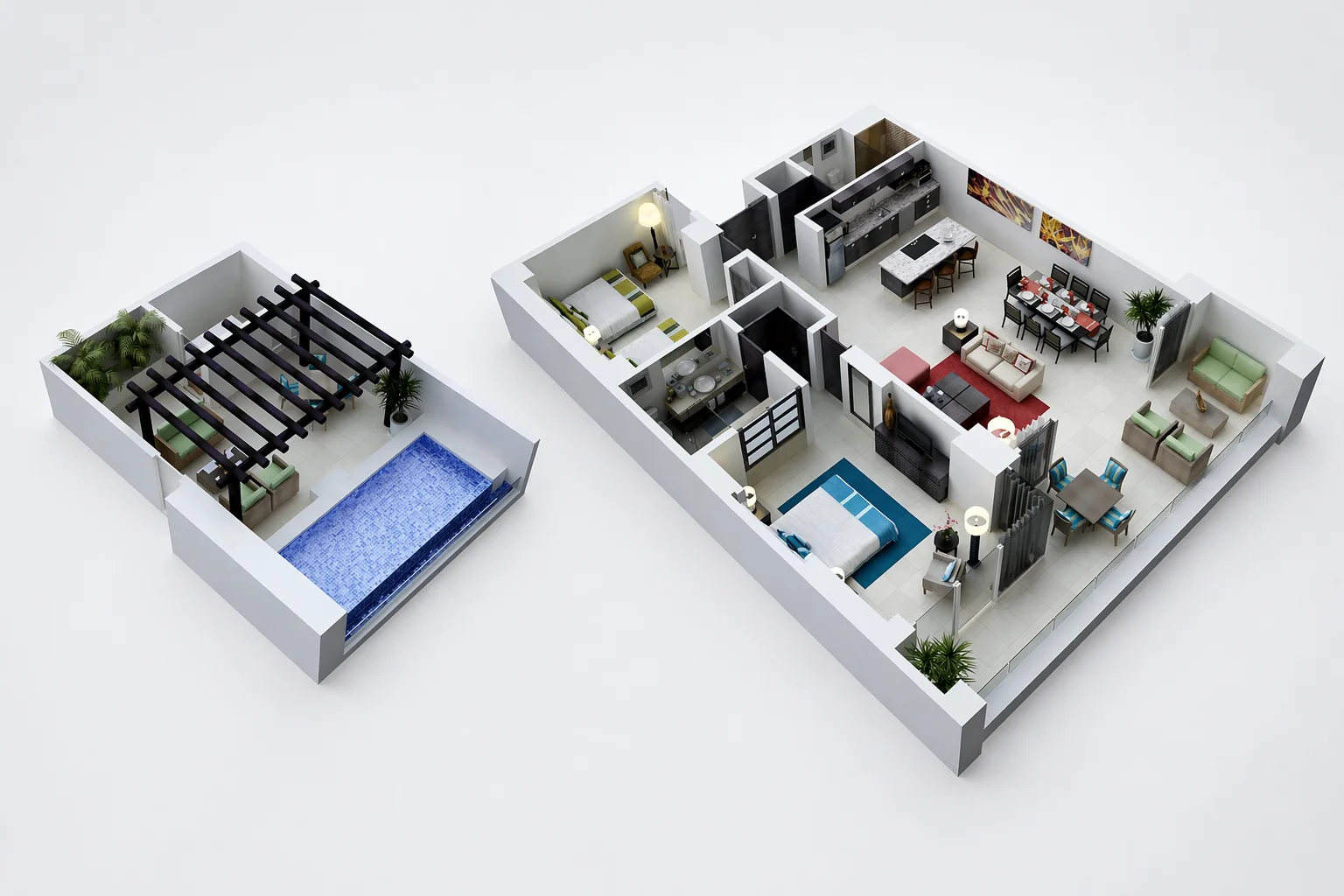 Cuenta con dos dormitorios totalmente equipados, terraza privada en el primer piso, cocina, amplia sala de estar y una piscina privada y camastros en el piso más alto.